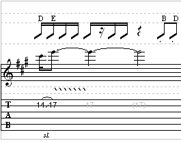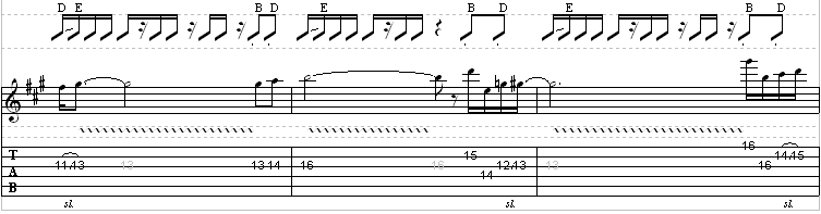 Notes: A nice collection of bends, pulls, and slides, these three measures hint back at the main theme. A good rule of thumb for not only this part but all other solo parts is that you’ll see a recurring guitar theme ALWAYS comes right on the B and D power chords that are dotted in the measures at the top of the tablature staff. This is a great ‘pick-up’ place for lead work.