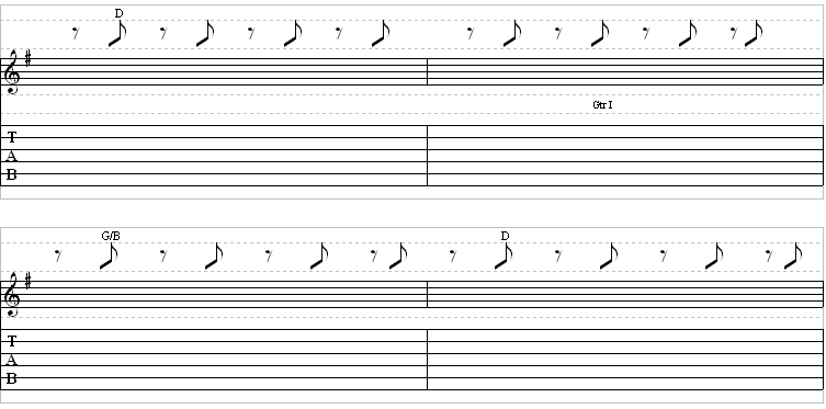 The second guitar part is very particular about the rhythm and is by far the hardest part to play. In the first two measures use a slight palm mute. To do this you’ll rest the heel of your picking hand lightly on the strings just before the bridge and apply a little pressure as you pick the string. This will create a slightly muffled tone for the notes. It’s mostly quick 16th notes. Try a down up down up picking pattern.