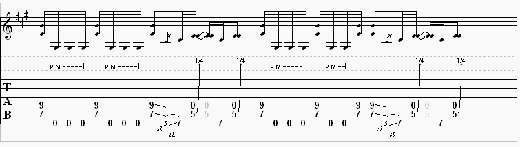 To start off this song, use your 1st finger and place it on the "A" string on the seventh fret. While keeping that finger there, place your 3rd finger on the ninth fret on the "D" string. Play it once. That is a basic power chord. That is about all that is basic in this song. Next, you will need to play the "low E" open three times, and palm mute all other strings not being played. Now perform the power chord we just saw again. Play it once. Play the open "low E" again three times (palm muting again as well), and then go back to the power chord on the seventh and ninth fret: