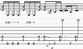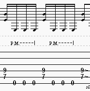 P.M. - Palm mute - this is performed by muting the notes with your pick hand by lightly touching the string(s) near the bridge.