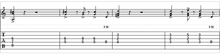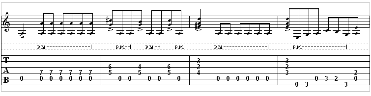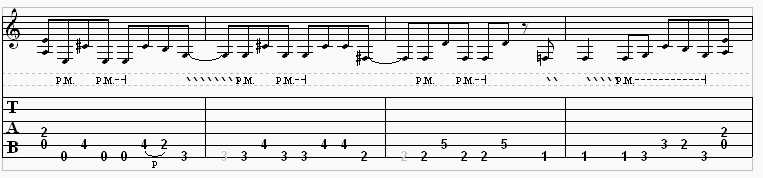 Both riffs have extensive use of palm mutes (P.M.)